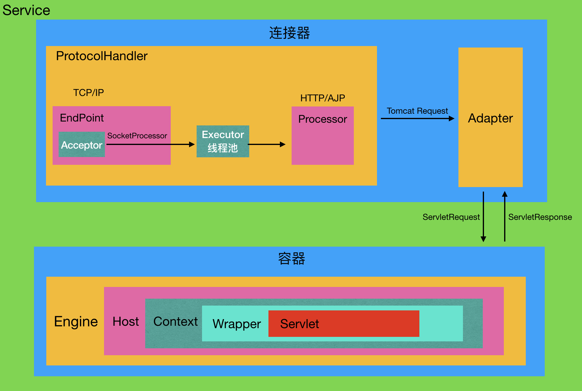 Processor 进行应用层对应的解析,如HTTP1.1协议,为请求和响应生成对应的Tomcat 的 Request 和 Response