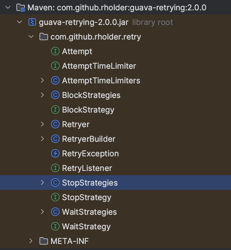| . ├── Attempt // 执行的结果包装(可能成功或失败) 【接口】 ├── AttemptTimeLimiter // 执行时间限制接口(实际方法由它执行)【接口】 ├── AttemptTimeLimiters // 执行时间限制接口实现工厂类【类】 ├───── FixedAttemptTimeLimit // 固定限制执行时间【类】 ├───── NoAttemptTimeLimit // 不限制执行时间【类】 ├── BlockStrategy // 执行阻塞策略接口【接口】 ├── BlockStrategies // 执行阻塞策略工厂类【类】 ├───── ThreadSleepStrategy // 通过Thread.sleep进行阻塞的实现【类】 ├── RetryException // 重试异常类【类】 ├── RetryListener // 重试监听器接口【接口】 ├── Retryer // 实际执行重试器【类】 ├───── ExceptionAttempt // 执行异常的结果包装【类】 ├───── ResultAttempt // 执行成功的结果包装【类】 ├───── RetryerCallable // 没有使用..【类】 ├── RetryerBuilder // 重试构造器【类】 ├───── ExceptionClassPredicate // 用于异常类型判断是否需要重试断言【类】 ├───── ExceptionPredicate // 根据异常进行判断是否需要重试断言【类】 ├───── ResultPredicate // 根据执行结果判断是否需要重试断言【类】 ├── StopStrategy // 终止策略【接口】 ├── StopStrategies // 终止策略实现工厂类【类】 ├───── NeverStopStrategy // 永不终止【类】 ├───── StopAfterAttemptStrategy // 限制最多重试次数进行终止【类】 ├───── StopAfterDelayStrategy // 限制总执行时间进行终止【类】 ├── WaitStrategy // 等待时间计算策略【接口】 ├── WaitStrategies // 等待时间计算策略实现工厂【类】 ├───── CompositeWaitStrategy // 复合等待时间计算类(聚合其他实现类)【类】 ├───── ExceptionWaitStrategy // 根据特定类型异常计算等待时间【类】 ├───── ExponentialWaitStrategy // 每次等待时间进行指数增长【类】 ├───── FibonacciWaitStrategy // 每次等待时间进行fibonacci方式增长【类】 ├───── FixedWaitStrategy // 每次都是固定的等待时间【类】 ├───── IncrementingWaitStrategy // 根据初始值和指定值,每次重试增加指定值时间【类】 └───── RandomWaitStrategy // 指定一个时间范围,每次在其中进行随机取值【类】