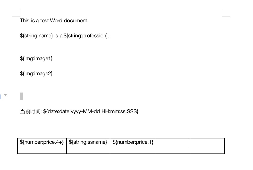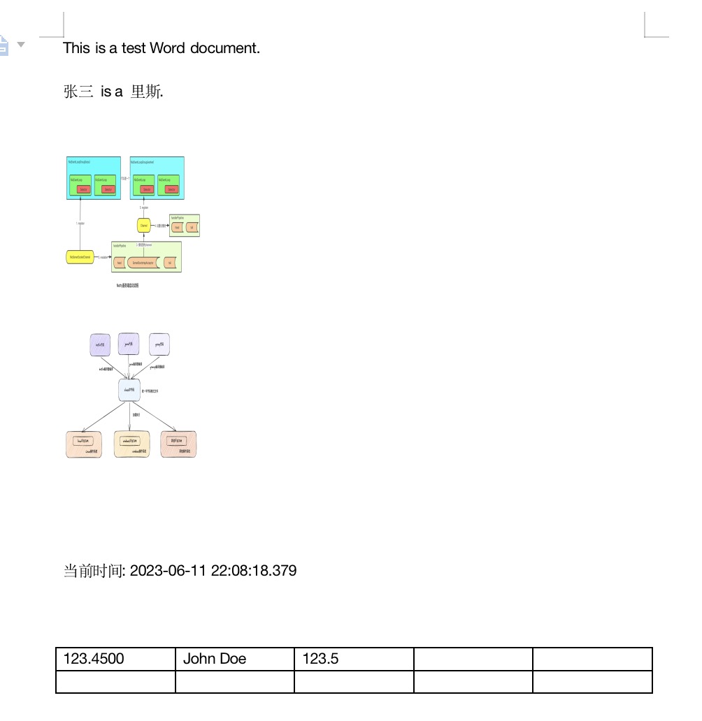 1 2 3 4 5 6 7 8 Map<String, Object> placeholderMap = new HashMap <>(); placeholderMap.put("name" , "张三" ); placeholderMap.put("profession" , "里斯" ); placeholderMap.put("ssname" , "John Doe" ); placeholderMap.put("price" , String.valueOf(123.45 )); placeholderMap.put("date" , new Date ()); placeholderMap.put("image1" , "https://zhengw-tech.com/images/netty-server.png" ); placeholderMap.put("image2" , "https://zhengw-tech.com/images/jvm-class.png" );
